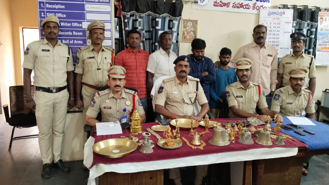 సిద్దిపేట పట్టణానికి చెందిన  ఇద్దరు  బోదాసు యాదగిరి, కోమిరే శ్రీను లు భువనగిరి రూరల్ పోలీస్ స్టేషన్ పరిధిలోకి వచ్చి ప్రతి రోజు రాత్రి సమయంలో గ్రామ శివారులలోని ఊరిదేవాలయాలలో ఉన్న వస్తువులను దొంగిలిస్తూ, సుమారు 5 గుడులలో దొంగతనం చేసి, దొరకకుండా తిరుగుతుండగా, రూరల్ పోలీస్ స్టేషన్ క్రైమ్ సిబ్బంది సిసి టీవీ ఫుటేజ్  లను పరిశీలిస్తూ, వారిపై నిఘా ఉంచి, సోమవారం  నిదితులను అదుపులోకి తీసుకోని, వారి నుండి బంగారు ఆభరణాలను స్వాధీనం చేసుకొని,