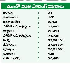 రాష్ట్ర వ్యాప్తంగా తుది విడతలో 182 మండలాల్లోని 3,752 పంచాయతీల్లో జరగనున్న సర్పంచ్ ఎన్నికలకు సర్వం సిద్దం చేసినట్టు ఎన్నికల సంఘం మంగళవారం ఒక ప్రకటనలో తెలిపింది. సర్పంచ్ స్థానాలకు 12,652 మంది, వార్డు స్థానాలకు 75,725 మంది అభ్యర్థులు పోటీ పడుతున్నారు. ఉదయం 7 గంటల నుంచి మధ్యాహ్నం ఒంటి గంట వరకు పోలింగ్, ఆ తర్వాత మధ్యాహ్నం 2గంటల నుంచి కౌటింగ్ ఉంటుందన్నారు. 31 జిల్లాల్లో 36,483 పోలింగ్ స్టేషన్లు ఏర్పాటు చేసినట్టు తెలిపారు.53,06,401 మంది ఓటర్లు తమ ఓటు హక్కును వినియోగించుకోనున్నారు. ఇందులో 26,01,861 మంది పురుష ఓటర్లు, 27,04,394 మంది మహిళా ఓటర్లు, 140 మంది ఇతరులు ఉన్నారని వివరించారు. ప్రతీ పోలింగ్ స్టేషన్ వద్ద సీసీ కెమెరాలను ఏర్పాటు చేశామని పేర్కొన్నారు.