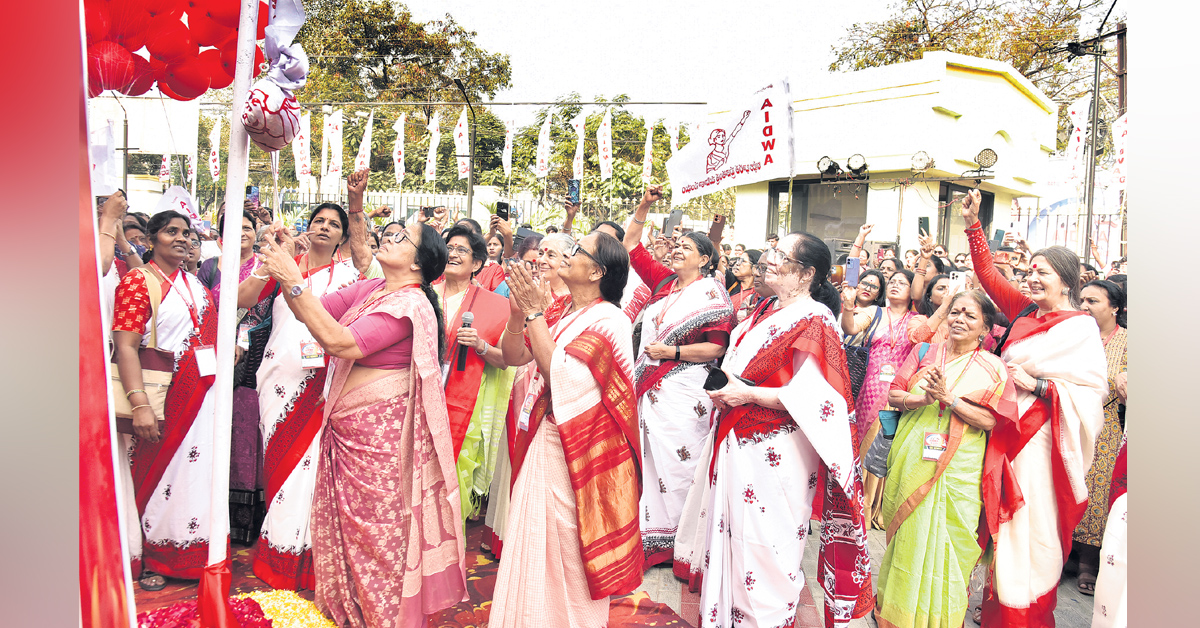 అఖిల భారత ప్రజాతంత్ర మహిళా సంఘం(ఐద్వా) 14వ అఖిల భారత మహాసభలు హైదరాబాద్‌ లోని ఆర్టీసీ కళ్యాణ మండపం ప్రాంగణంలో ఆదివారం అత్యంత ఉత్సాహ పూరితంగా ప్రారంభమయ్యాయి. మహాసభల ప్రారంభ సూచికగా ఐద్వా అఖిల భారత అధ్యక్షులు పీకే శ్రీమతి సంఘం జెండాను ఆవిష్కరించారు. ఈ సందర్భరగా 14వ మహాసభ సూచనగా.. 14 బెలూన్లు ఎగిరేశారు. ‘అన్యాయం అక్రమం అంతం చేస్తూ దౌర్జన్యం దుర్మార్గం ధనుమాడిస్తూ స్త్రీలకు ధైర్యశక్తి అందించేది అఖిల భారత మహిళా సంఘటిత సంఘం. ఎత్తరా ఐద్వా జెండా’ అంటూ ప్రజానాట్యమండలి కళాకారులు గీతాన్ని ఆలపించారు.. అనంతరం ప్రతినిధులంతా ఒకరి తరువాత ఒకరిగా అమరవీరుల స్థూపం వద్ద రెడ్‌ సెల్యూట్‌ చేస్తూ నివాళులర్పించారు.