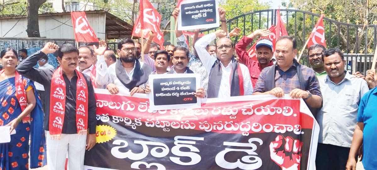 కేంద్ర ప్రభుత్వం కార్మికుల హక్కులను హరిస్తూ.. కార్పొరేట్ల లాభాల కోసం రూపొందించిన నాలుగు లేబర్ కోడ్లను వెంటనే రద్దు చేయాలని కార్మిక లోకం డిమాండ్ చేసింది. ‘మా హక్కులను కాలరాయొద్దు.. యాజమాన్యా లకు బానిసలుగా మార్చొద్దు..’ అంటూ రాష్ట్ర వ్యాప్తంగా బుధవారం నిరసన కార్యక్రమాలు చేపట్టారు. కేంద్ర ప్రభుత్వం 1వ తేదీ నుంచి అమలు చేస్తున్న నాలుగు లేబర్కోడ్లు కార్మికవర్గంపై తీవ్రమైన దాడి అని, ఇది చట్టాల మార్పుకాదు, కార్మిక హక్కుల అపహరణ అని ఆగ్రహం వ్యక్తంచేశారు. సింగరేణిలో నల్లబ్యాడ్జీలు ధరించి తమ నిరసన వ్యక్తం చేశారు. హైదరాబాద్ సహా అన్ని జిల్లాల్లో లేబర్కోడ్లపై నిరసన కార్యక్రమాలు జరిగాయి.