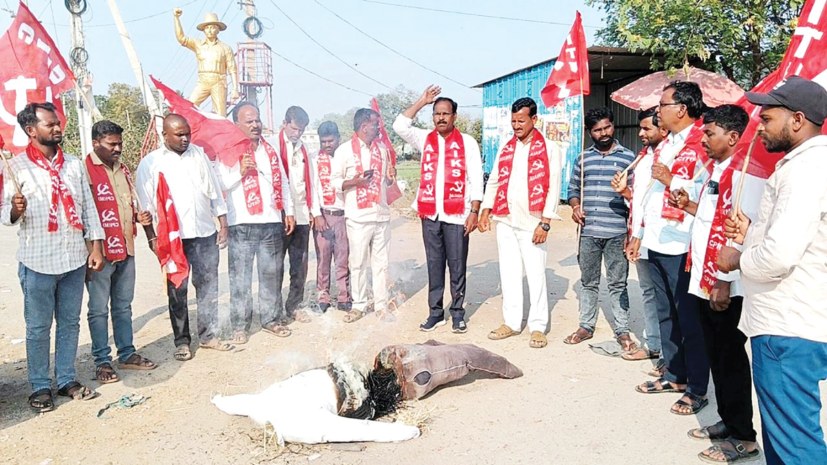 అమెరికాతో స్వేచ్ఛా వాణిజ్య ఒప్పందాన్ని రద్దు చేసే వరకు ఐక్యంగా పోరాడుదామని తెలంగాణ రైతుసంఘం రాష్ట్ర ప్రధాన కార్యదర్శి టి సాగర్ అన్నారు. బీజేపీ ప్రభుత్వం అమెరికాకు లొంగిపోయి ఏకపక్షంగా స్వేచ్ఛా వాణిజ్య ఒప్పందం చేసుకోవడాన్ని వ్యతిరేకిస్తూ నారాయణ పేట జిల్లా దామరగిద్ద మండల కేంద్రంలో ప్రజాసంఘాల ఆధ్వర్యంలో అంబేద్కర్ చౌరస్తాలో మోడీ, ట్రంప్ల దిష్టి బొమ్మను దహనం చేశారు. ఈ సందర్భంగా సాగర్ మాట్లాడుతూ ఈనెల 12వ తేదీన జరుగు దేశ వ్యాప్త సమ్మెలో కార్మికులు, రైతులు, వ్యవసాయ కార్మికులతో పాటు విద్యార్థులు, యువజనులు, మహిళలు, మేధావులు, సామాజిక తరగతులు భాగస్వాములు కావాలని కోరారు. దేశ స్వాతంత్య్రాన్ని ,సార్వభౌమత్వాన్ని అమెరికాకు తాకట్టు పెట్టే ప్రయత్నం చేస్తున్నారని అందులో భాగంగానే అమెరికాతో ఒప్పందాలు చేసుకున్నారని అన్నారు.
