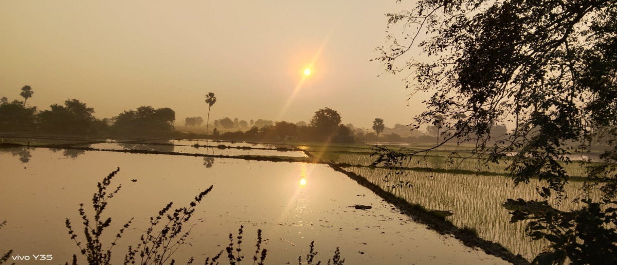 అప్పుడే ఉదయించిన సూర్యుడు లేత కిరణాలతో నింగి నుండి నేలను తాకాడు. కిరణాలు పొలంపై వాలడంతో ఆహ్లాదంతో అవి చూపరులను ఎంతగానో ఆకట్టుకున్నాయి. దీంతో పొలాలను పొద్దు ముద్దాడినట్లుగా ఉంది.