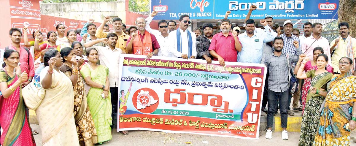 ప్రభుత్వ ఆస్పత్రుల్లో పనిచేస్తున్న శానిటేషన్, స్వీపర్స్, పేషంట్ కేర్, సెక్యూరిటీల సమస్యలు పరిష్కరించాలని తెలంగాణ యునైటెడ్ మెడికల్ అండ్ హెల్త్ ఎంప్లాయీస్ యూనియన్ (సీఐటీయూ) రాష్ట్ర గౌరవ అధ్యక్షులు భూపాల్, అధ్యక్ష ప్రధాన కార్యదర్శులు ఎండీ ఫసియోద్దీన్, కె.యాదనాయక్ డిమాండ్ చేశారు. గురువారం హైదరాబాద్ కోఠిలోని డీఎంహెచ్ఎస్ ప్రాంగణంలో పెద్దఎత్తున ధర్నా నిర్వహించారు. ఈ సందర్భంగా భూపాల్ మాట్లాడుతూ.. ప్రభుత్వ జనరల్ ఆస్పత్రులు, మెడికల్ కాలేజీలు, వైద్య విధాన పరిషత్ పరిధిలోని కమ్యూనిటీ హెల్త్ సెంటర్లు, ఏరియా ఆస్పత్రులు, జిల్లా ఆస్పత్రుల్లో పనిచేస్తున్న కాంట్రాక్ట్ కార్మికులు అనేక సమస్యలు ఎదుర్కొంటున్నారని తెలిపారు. ప్రభుత్వం నిర్ణయించిన వేతనాలు చెల్లించకుండా కాంట్రాక్టర్లు తక్కువ ఇస్తున్నారని ఆవేదన వ్యక్తం చేశారు. రూ.15,600 వేతనంలో భాగంగా కార్మికులకు చెల్లించాల్సిన మొత్తాన్ని తగ్గించి సుమారు రూ.11,000 మాత్రమే ఇస్తున్నారని చెప్పారు. ప్రభుత్వం నిర్ణయించిన విధంగా వేతనాలు చెల్లించేలా ఆస్పత్రుల అధికారులకు, కాంట్రాక్టర్లకు ఆదేశాలు ఇవ్వాలని కోరారు.