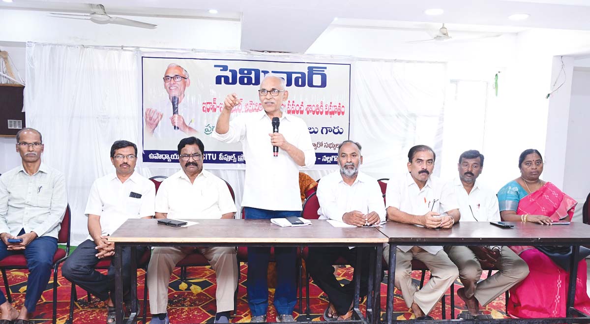 యుద్ధంతో ప్రపంచ మానవాళికి ప్రత్యక్షంగా పరోక్షంగా ముప్పు ఉందని సీపీఐ(ఎం) పొలిట్ బ్యూరో సభ్యులు బీవీ.రాఘవులు ఆందోళన వ్యక్తం చేశారు. ‘యుద్ధం వద్దు -ప్రపంచ శాంతి కావాలి’ అని కోరుతూ ఇరాన్, ఇజ్రాయిల్, అమెరికా యుద్ధం- ప్రపంచానికి విఘాతం అనే అంశంపై మంగళవారం నల్లగొండలో టీఎస్యూటీఎఫ్, సీఐటీయూ, పీపుల్స్ ప్రోగ్రెస్ ఫోరం ఆధ్వర్యంలో ఫోరం జిల్లా అధ్యక్షులు ఎడ్ల సైదులు అధ్యక్షతన సెమినార్ నిర్వహించారు. ఈ సందర్భంగా రాఘవులు ప్రసంగిస్తూ.. అమెరికా అధ్యక్షులు ట్రంప్ రౌడీలా వ్యవహరిస్తూ ప్రపంచదేశాలపై ఆధిపత్యం సాగించా లని ఆకాంక్షిస్తున్నారని, అందులో భాగంగానే వెనిజులా అధ్యక్షున్ని అరెస్టు చేసి నిర్బంధించారని చెప్పారు. ఇరాన్, వెనిజులా దేశాల్లో ఉన్న చమురు నిల్వలను ఆధీనంలోకి తెచ్చుకోవాలనే కుట్రతో యుద్ధం ప్రారంభించారన్నారు. ఇరాన్ దేశంలో అణు ఆయుధాలు, అణు బాంబుల నిల్వలు ఉన్నాయనే సాకుతో యుద్ధం ప్రారంభించిన ట్రంప్ పదిరోజుల్లో ఆ దేశం తమ ఆధీనం లోకి వస్తుందని కలలుగన్నారని చెప్పారు. ఇరాన్ను రాతియుగానికి నెట్టేస్తా మని మొదట్లో ప్రకటించారని, ఇజ్రాయిల్ అమెరికా దాడులపై ఇరాన్ ప్రతిఘ టించి ”ప్రాణాలైనా అర్పిస్తాం.. అమెరికాకు లొంగిపోం” అంటూ సాహసో పేతంగా యుద్ధం చేసిందన్నారు. యుద్ధం వల్ల అమెరికా సైతం ఆర్థికంగా నష్టపోతున్నదని, యుద్ధం ఆపాలని ఆ దేశ ప్రజలు కోరుతున్నప్పటికీ కార్పొరేట్ పెట్టుబడిదారుల కోసం యుద్ధాన్ని కొనసాగిస్తున్నారని విమర్శించారు. ట్రంప్ యుద్ధకాంక్షను ఆ దేశ ప్రజలతోపాటు ప్రపంచం మొత్తం వ్యతిరేకిస్తోందని చెప్పారు.