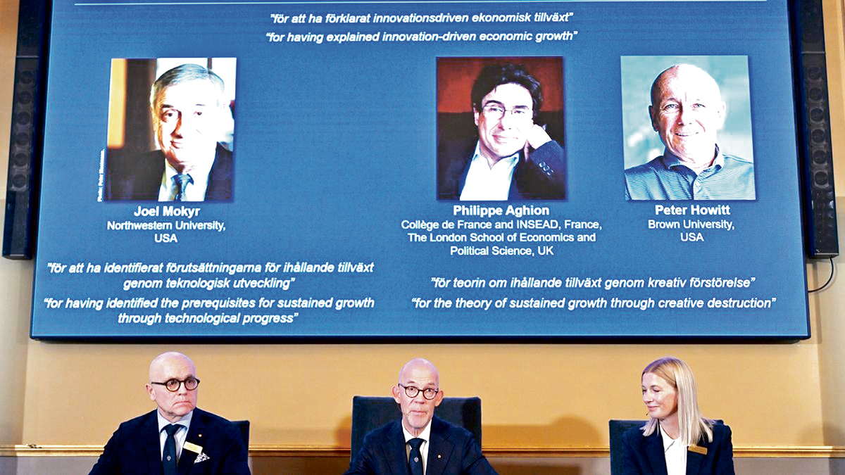 స్టాకహేోం : ‘ఆవిష్కరణల ఆధారిత ఆర్థిక వృద్ధిని’ వివరించినందుకు గానూ ఈ ఏడాది ముగ్గురు పరిశోధకులు జోయల్ మోకిర్, ఫిలిప్ అగియన్, పీటర్ హోవిట్లకు ఆర్థిక శాస్త్రంలో నోబెల్ పురస్కారం లభించింది. వీరిలో జోయల్ మోకిర్కు బహుమతిలో సగం మొత్తం చెందుతుంది. సాంకేతిక పురోగతి ద్వారా సుస్థిర వృద్ధిని సాధించేందుకు ముందస్తుగా అవసరమైనవాటిని గుర్తించడానికి ఆయన కృషి చేశారు. మిగిలిన సగం మొత్తాన్ని అగియన్, హోవిట్లు పంచుకుంటారు. ‘సృజనాత్మకమైన విధ్వంసం ద్వారా సుస్థిర వృద్ధి సిద్ధాంతాన్ని రూపొందించినందుకు’ గానూ వీరికి ఈ మొత్తం లభిస్తోంది. సుస్థిరమైన అభివృద్ధి లేదా పురోగతి అనేది సరికొత్త సాధారణ స్థాయికి మారేందుకు గల కారణాలు వెల్లడించడానికి చారిత్రవ వనరులను ఒక మార్గంగా మోకిర్ ఉపయోగించారు. ఈ సుస్థిర వృద్ధి వెనుక గల మెకానిజంను అగియన్, పీటర్ హొవిట్లు కూడా అధ్యయనం చేశారు. 1992లో వారు సృజనాత్మక విధ్వంసం అని పిలిచే ఒక గణిత నమూనాను రూపొందించారు. ఈ మేరకు వారు ఒక వ్యాసం కూడా రాశారు. ఇక్కడ సృజనాత్మక విధ్వంసం అంటే కొత్తదైన, మెరుగైన ఉత్పత్తి మార్కెట్లోకి ప్రవేశిస్తే, కంపెనీలు పాత ఉత్పత్తులను తక్కువ మొత్తాలకు విక్రయించడమని వారు పేర్కొన్నారు. ఈ మేరకు నోబెల్ కమిటీ ఒక ప్రకటన విడుదల చేసింది.