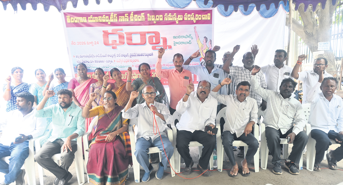 రాష్ట్రంలోని అన్ని యూనివర్సిటీలలో పనిచేస్తున్న టైం స్కేల్ ఉద్యోగులను శాశ్వత ఉద్యోగులుగా పరిగణించాలని తెలంగాణ యూనివర్సిటీస్ ఎంప్లాయీస్ అండ్ వర్కర్స్ యూనియన్(సీఐటీయూ) డిమాండ్ చేసింది. టైం స్కేల్, డైలీ వేజెస్, ఎమ్మెన్నార్, కంటీంజెంట్, కాంట్రాక్ట్, ఔట్ సోర్సింగ్ ఉద్యోగులకు ఉద్యోగ భద్రత కల్పించి, దీర్ఘకాలిక సమస్యలను పరిష్కరించాలని కోరింది. యూనియన్ ఆధ్వర్యంలో హైదరాబాద్ ఇందిరాపార్క్ ధర్నాచౌక్ వద్ద మంగళవారం కాంట్రాక్ట్, ఔట్సోర్సింగ్, టైం స్కేల్ ఉద్యోగులు ధర్నా నిర్వహించారు. ఈ సందర్భంగా యూనియన్ గౌరవ అధ్యక్షులు జె.వెంకటేష్ మాట్లాడుతూ.. రాష్ట్రంలోని 18 యూనివర్సిటీల్లో సుమారు 10 వేల మంది నాన్ టీచింగ్ సిబ్బంది టైం స్కేల్, డైలీ వేజెస్, ఎన్ఎంఆర్, కంటింజెంట్, కాంట్రాక్ట్, ఔట్సోర్సింగ్ విధానాల్లో దీర్ఘకాలంగా పనిచేస్తున్నారని తెలిపారు. కనీస వేతనాలు, చట్టబద్ధ సౌకర్యాలు లేకపోవడం వల్ల వారు అనేక ఇబ్బందులు ఎదుర్కొంటున్నారని చెప్పారు. 20, 30 సంవత్సరాలు యూనివర్సిటీకి సేవలందించిన ఉద్యోగులు రిటైర్ అయిన తర్వాత ఒట్టి చేతులతో ఇంటికి వెళ్లాల్సి రావడం అత్యంత బాధాకరమన్నారు. సర్వీస్లో ఉన్నప్పుడు అనారోగ్యానికి గురైతే ఆదుకునే దిక్కే లేదన్నారు. సమాన పనికి సమాన వేతనం అమలు చేయాలని, 10 సంవత్సరాలకుపైగా సేవలందించిన వారిని రెగ్యులర్ ఉద్యోగులుగా గుర్తించాలని డిమాండ్ చేశారు. నాన్ టీచింగ్ సిబ్బందికి కనీస వేతనం రూ.26 వేలు చెల్లించడంతోపాటు పీఎఫ్, ఈఎస్ఐ వంటి సౌకర్యాలు కల్పించాలని కోరారు. అలాగే రూ.10 లక్షల ప్రమాద బీమా, ఆరోగ్య బీమా సౌకర్యం కల్పించాలన్నారు. యూనియన్ అధ్యక్షులు మెట్టు రవి మాట్లాడుతూ.. ఉద్యోగుల వయోపరిమితిని 61 సంవత్సరాలకు పెంచాలని, ఉద్యోగ విరమణ సమయంలో రూ.20 లక్షల గ్రాట్యూటీ చెల్లించాలని విజ్ఞప్తి చేశారు. సర్వీసులో ఉన్న టైం స్కేల్, కాంట్రాక్ట్, ఔట్సోర్సింగ్ ఉద్యోగి ఏ కారణం చేతనైనా మరణిస్తే ఆ కుటుంబ వారసులకు ఉద్యోగం ఇవ్వాలని డిమాండ్ చేశారు. మహిళా ఉద్యోగులకు ఆరు నెలల వేతనంతో కూడిన ప్రసూతి సెలవులు మంజూరు చేయాలన్నారు. అసెంబ్లీ సమావేశాలు జరుగుతున్న సందర్భంగానైనా ప్రభుత్వం తమ డిమాండ్లను పరిష్కరించాలని కోరారు. ఈ కార్యక్రమంలో యూనియన్ వర్కింగ్ ప్రెసిడెంట్ పద్మశ్రీ, కార్యదర్శి దశరథ్, నాయకులు దేవేందర్, అంజయ్య, రవికుమార్, శ్రీనివాస్, మహేందర్, చిరంజీవి, టైం స్కేల్, కాంట్రాక్ట్, ఔట్సోర్సింగ్ ఉద్యోగులు పాల్గొన్నారు.