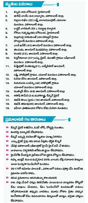 రెప్పపాటు క్షణంలో ఊహించని ఘటన. ఏం జరిగిందో తెలుసుకొనేలోపే 19 మంది విగతజీవులు అయ్యారు. కంకర టిప్పర్‌ రూపంలో మృత్యువు వారిని కబళించింది. కూర్చున్న సీట్లోనే కంకర కప్పెయడంతో ఊపిరిరాడక తల్లడిల్లుతూనే తుదిశ్వాస విడిచారు. కాలేజీకని కొందరు.. దవాఖానకు మరికొందరు.. వ్యక్తిగత పనుల మీద ఇంకొందరు.. తాండూర్‌ నుంచి ఆర్టీసీ బస్సులో బయల్దేరారు. మరో గంటలో గమ్యం చేరేవారే.. ఇంతలోనే ఊహించని ప్రమాదం వారి ప్రాణాల్ని బలితీసుకుంది.