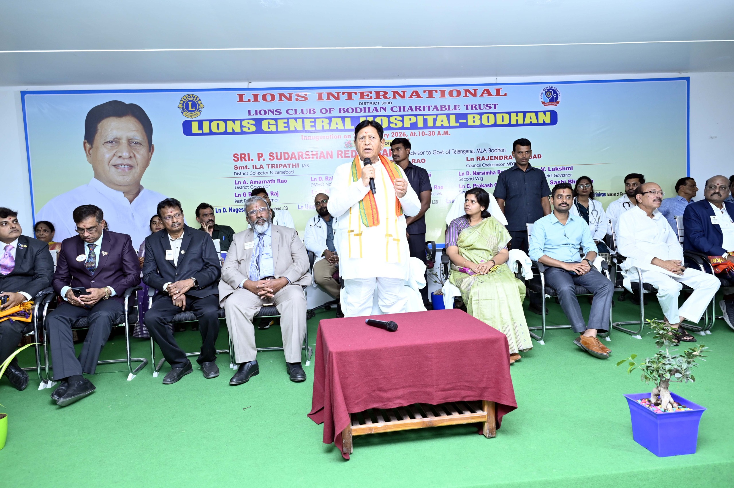 బోధన్ పట్టణంలో లయన్స్ చారిటబుల్ ట్రస్ట్ ఆధ్వర్యంలో నూతనంగా నెలకొల్పిన లయన్స్ జనరల్ ఆసుపత్రిని రాష్ట్ర ప్రభుత్వ సలహాదారు పి.సుదర్శన్ రెడ్డి, కలెక్టర్ ఇలా త్రిపాఠి శుక్రవారం ప్రారంభించారు. ఆసుపత్రిలోని వివిధ విభాగాలను సందర్శించి, అందుబాటులో ఉన్న సదుపాయాలను పరిశీలించారు. ఈ సందర్భంగా ఏర్పాటు చేసిన సభలో ప్రభుత్వ సలహాదారు సుదర్శన్ రెడ్డి మాట్లాడుతూ, పేదలకు నామమాత్రపు రుసుముతో నాణ్యమైన రీతిలో ఆరోగ్య సేవలను అందుబాటులోకి తేవాలనే ఉద్దేశ్యంతో లయన్స్ చారిటబుల్ ట్రస్ట్ వారి ఆధ్వర్యంలో ఈ ఆసుపత్రిని ఏర్పాటు చేయించామని అన్నారు. గడిచిన పాతిక సంవత్సరాల నుండి లయన్స్ కంటి ఆసుపత్రి ద్వారా సంతృప్తికరమైన రీతిలో సేవలు అందిస్తున్నారని, దీనికి అనుసంధానంగా ప్రస్తుతం కొత్తగా ఏర్పాటు చేసిన జనరల్ ఆస్పత్రి ద్వారా కూడా మెరుగైన వైద్య సేవలు అందించి ప్రజల్లో మంచి పేరు పొందాలని అన్నారు.