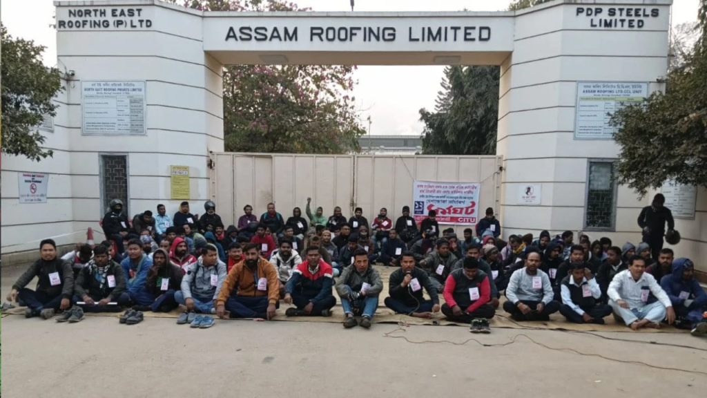 అస్సాంలోని కామ్రూప్ మెట్రోపాలిటన్ జిల్లాలోని ఒక రూఫింగ్ కంపెనీ ప్రవేశ ద్వారం వద్ద కార్మికులు …