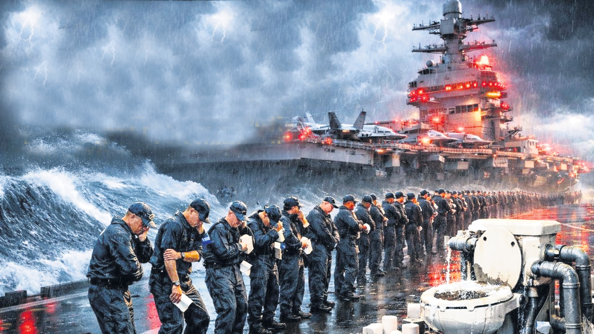 నివేదికల ప్రకారం.. ఎనిమిది నెలలుగా నడి సముద్రంలో ఉన్న యుద్ధనౌకలోని మురుగునీటి వ్యవస్థలో ఇటీవల వైఫల్యం తలెత్తింది. యుద్ధనౌక నిరంతరం కదులుతున్నందున, సరైన నిర్వహణ లేకపోవడంతో అందులో ఉన్న మొత్తం 650 మరుగుదొడ్లలో చాలా వరకు పనిచేయడం లేదు. దీంతో మహిళా సిబ్బందితో పాటు పురుషులు తీవ్ర ఇబ్బందులు పడుతున్నారు. బాత్రూంను ఉపయోగించు కోవాలంటే సిబ్బంది రోజు దాదాపు 45 నిమిషాల పాటు క్యూలో నిల్చోవాల్సి వస్తోంది. ఈ సమస్యను పరిష్కరించడానికి నౌకలోని సాంకేతిక నిపుణులు రోజుకు 19 గంటలు పనిచేస్తున్నా లాభం లేకుండా పోతోంది.