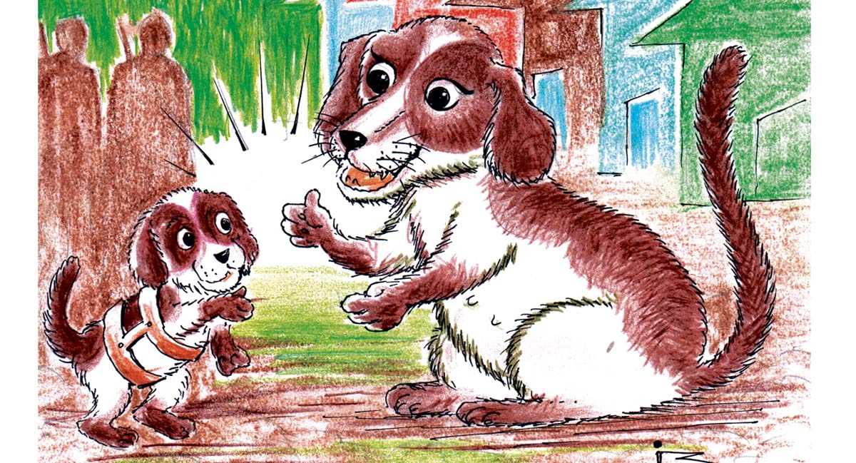 అదే సమయంలో అటుగా వచ్చిన మరొక పెంపుడు కుక్క టామీని చూసి, కోపంగా ”ఛీ ఛీ! నువ్వు వీధి కుక్కవి! ఇక్కడి నుంచి పో!” అని పెద్దగా అరిచింది.
