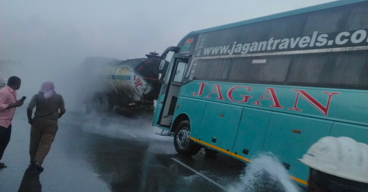 దీంతో ట్యాంకర్ కెమికల్ లీకై రోడ్ మీద పడడంతో పొగలు కముకున్నాయి. వెంటనే తేరుకున్న బస్సు డ్రైవర్ బస్సులో ప్రయాణికులను అప్రమత్తం చేయగా అందరూ ఎగ్జిట్ డోర్ల ద్వారా కిందికి దిగారు. ఈ ప్రమాదంలో కొందరు ప్రయాణికులు స్వల్ప గాయాలతో బయటపడ్డారు. విషయం తెలుసుకున్న ఫైర్ సిబ్బంది వెంటనే ఘటనా స్థలానికి చేరుకుని కెమికల్ లీకేజీ ద్వారా వస్తున్న పొగలను అదుపులోకి తెచ్చారు.