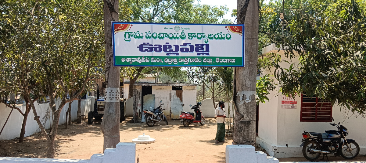 మండలంలోని ఊట్లపల్లి పంచాయతీ కార్యాలయం వద్ద కనిపిస్తున్న ఏర్పాటు చూసినవారికి కాసేపు నవ్వు, కాసేపు ఆశ్చర్యం కలిగిస్తోంది. సాధారణంగా కార్యాలయ నేమ్బోర్డు ఏర్పాటు చేయాలంటే రెండు వైపులా ఇనుప గొట్టాలు లేదా సిమెంట్ స్తంభాలు ఏర్పాటు చేస్తారు. కానీ ఇక్కడ మాత్రం చెట్లు నే స్తంభాలుగా ఉపయోగించారు.కార్యాలయం ప్రధాన ద్వారం కు ఇరువైపులా ఉన్న రెండు అలంకార చెట్ల మధ్యనే పంచాయతీ కార్యాలయ నేమ్బోర్డును బిగించారు.