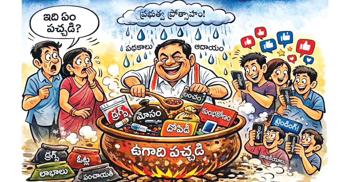 మాదకద్రవ్య ఉగాది పురస్కారాలు కూడా ఉంటాయని పరాభవ తెలియజేసింది. పెద్దలకొక న్యాయం, పేదలకొక న్యాయం మనకు తెలిసున్న విషయమే. రేవ్‌ పార్టీలని, ఫామ్‌హౌస్‌ పార్టీలనీ మనిషులు చాలా ముందుకు పోయారు. అక్కడ జరిగేదాన్ని అరికట్టడానికి సినిమాల్లోలాగ సింగిల్‌ ఆఫీసర్‌ సరిపోడు. గుంపుగాపోయినా మాఫియాలతో ఫైటింగ్‌ చేయవలసివుంటుంది. పోలీసులకంటే ముందు అటువైపునుండి కాల్పులు జరగొచ్చు. గంజాయి కనిపిస్తే సహించమని, ఎటువంటి మత్తు పదార్థాలను ప్రోత్సహించమని ఎన్నికల వాగ్దానాలను ఎలా గుమ్మరించారో ఇప్పుడు సోషల్‌ మీడియాలో పెడుతున్నారు. మాఫియా ఇంకా ఎక్కువగా డ్రగ్స్‌ను గుమ్మరిస్తోంది. ఈసారి ఉగాది పచ్చడిలో ఏమేమి కలిపారో కూడా తెలియడం లేదు. అలాగుంది పరిస్థితి అర్థం కానంతగా. ప్రభుత్వాల ప్రోత్సాహకాలు అలాగున్నాయి ఈ ఉగాదికి.