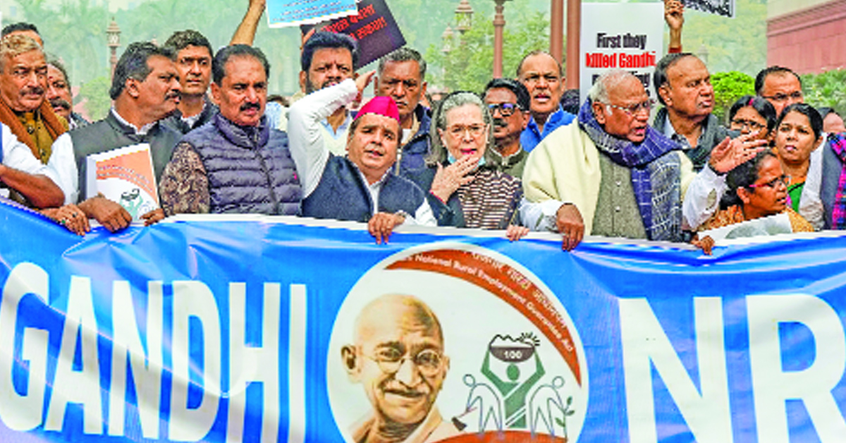 పార్లమెంట్ సమావేశాల ప్రారంభానికి ముందు పార్లమెంట్ ఆవరణలోనే ప్రతిపక్షాలు ఆందోళన చేపట్టాయి. ఉపాధి హామీ చట్టాన్ని నిర్వీర్యం చేసే బిల్లును ఉపసంహరించు కోవాలని నిరసన ప్రదర్శన చేపట్టాయి. ఎంజీఎన్ఆర్ఈజీఏ అనే భారీ బ్యానర్తో ప్లకార్డులు పట్టుకుని పార్లమెంట్లోని ప్రేరేపణ స్థల్లోని మహాత్మా గాంధీ విగ్రహం నుంచి మకర్ ద్వారం వరకు ప్రభుత్వ చర్యలను వ్యతిరేకిస్తూ నినాదాలతో ప్రదర్శన నిర్వహించాయి. అనంతరం ప్రతిపక్ష నేతలు కేంద్ర ప్రభుత్వ చర్యను పార్లమెంట్లోనూ, దేశంలో గ్రామ గ్రామాన తిప్పికొట్టాలని పిలుపునిచ్చారు. మోడీ ప్రభుత్వం మహాత్మాగాంధీని అవమానించడమే కాకుండా, దేశంలోని గ్రామాల్లో సామాజిక, ఆర్థిక పరివర్తన తీసుకురావడంలో కీలక పాత్ర పోషించిన పని హక్కును కూడా అణచివేస్తోందని విమర్శించారు.