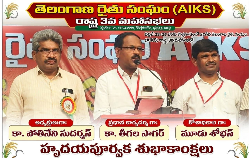 న‌వ‌తెలంగాణ‌-హైద‌రాబాద్: తెలంగాణ రైతు సంఘం రాష్ట్ర 3వ మహాసభలు కొత్తగూడెంలో విజయవంతంగా జరిగాయని, మహాసభలలో 32 తీర్మానాలను ఆమోదించామని, 93 మందితో నూతన కమిటీ 29 మందితో ఆఫీస్‌బేరర్స్ ఎన్నికయ్యారని హైదరాబాద్‌లోని సుందరయ్య విజ్ఞాన కేంద్రంలో సోమవారం(ఏప్రిల్ 27) జరిగిన విలేకరుల సమావేశంలో తెలంగాణ రైతు సంఘం రాష్ట్ర ప్రధాన కార్యదర్శి తీగల సాగర్, రాష్ట్ర కోశాధికారి మూడ్ శోభన్, రాష్ట్ర ఉపాధ్యక్షులు ప్రొ.. అరిబండి ప్రసాదరావులు ప్రకటించారు.