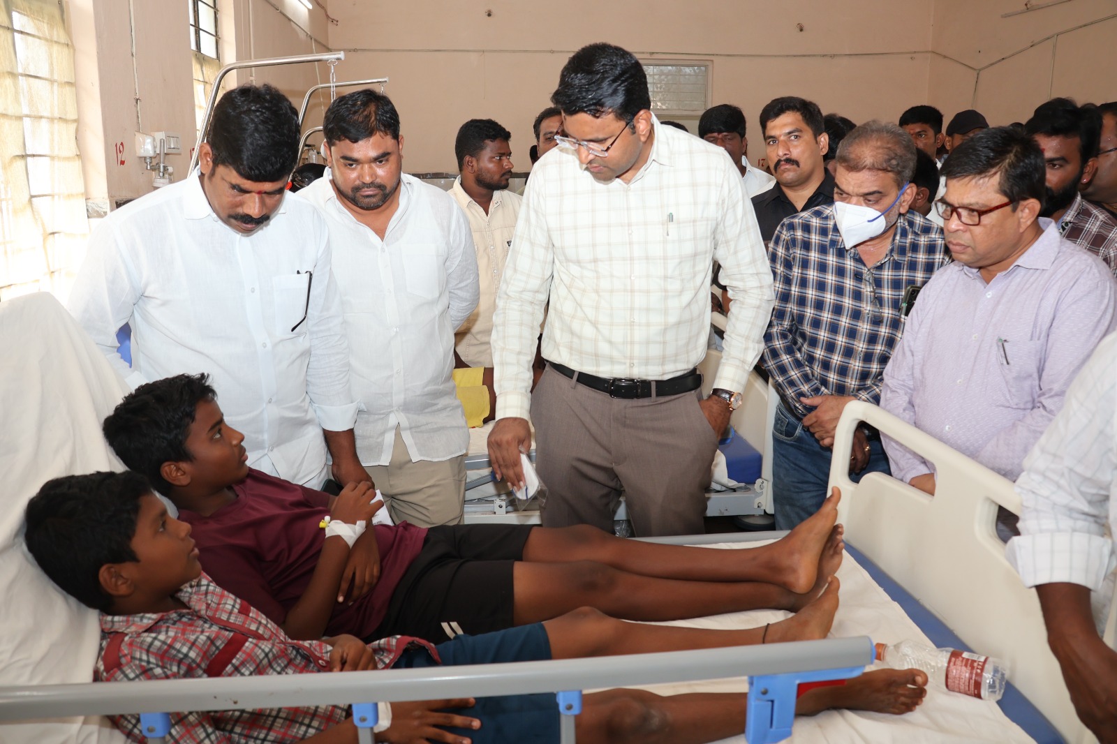 తాను కూడా ఎప్పటికప్పుడు అధికారులతో మాట్లాడి విద్యార్థులకు మెరుగైన వైద్య సేవలు అందించాలని సూచించినట్లు చెప్పారు. చికిత్స అనంతరం 32 మంది విద్యార్థులు బాగుండడంతో ఉదయం వారిని డిశ్చార్జి చేసినట్లు పేర్కొన్నారు. మిగిలిన 22 మంది విద్యార్థులను కూడా వారి ఆరోగ్య పరిస్థితిని బట్టి మధ్యాహ్నం వరకు డిశ్చార్జి చేయడం జరుగుతుందన్నారు. ఫుడ్ పాయిజన్ కు బాయిలర్ ఎగ్ కూడా కారణమని ఆరోపణలు వస్తుండడంతో శాంపిల్స్ ఉంటే ఫుడ్ ఇన్స్పెక్టర్ కు పంపించి పరీక్షలు చేయిస్తామన్నారు. ఈ సంఘటనపై సమగ్రంగా విచారణ జరిపించి నిర్లక్ష్యంగా వ్యవహరించినట్లు తేలితే బాధ్యులైన వారిని సస్పెండ్ చేస్తామన్నారు.