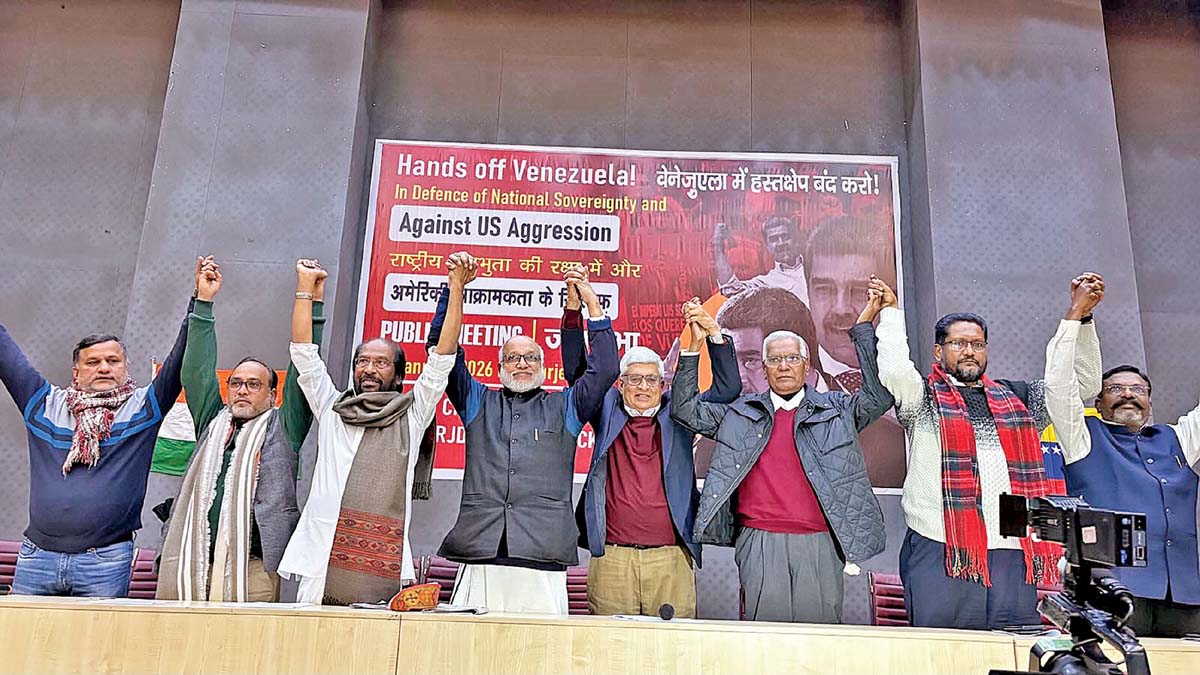 దేశ రాజధానిలోని హరికిషన్ సింగ్ సూర్జిత్ భవన్లో సోమవారం అమెరికా తీరును ఖండిస్తూ బహిరంగ సభ జరిగింది. సీపీఐ(ఎం) నేత ప్రకాశ్ కరత్ అధ్యక్షతన జరిగిన ఈ సభలో వామపక్ష పార్టీల నాయకులు పాల్గొన్నారు.