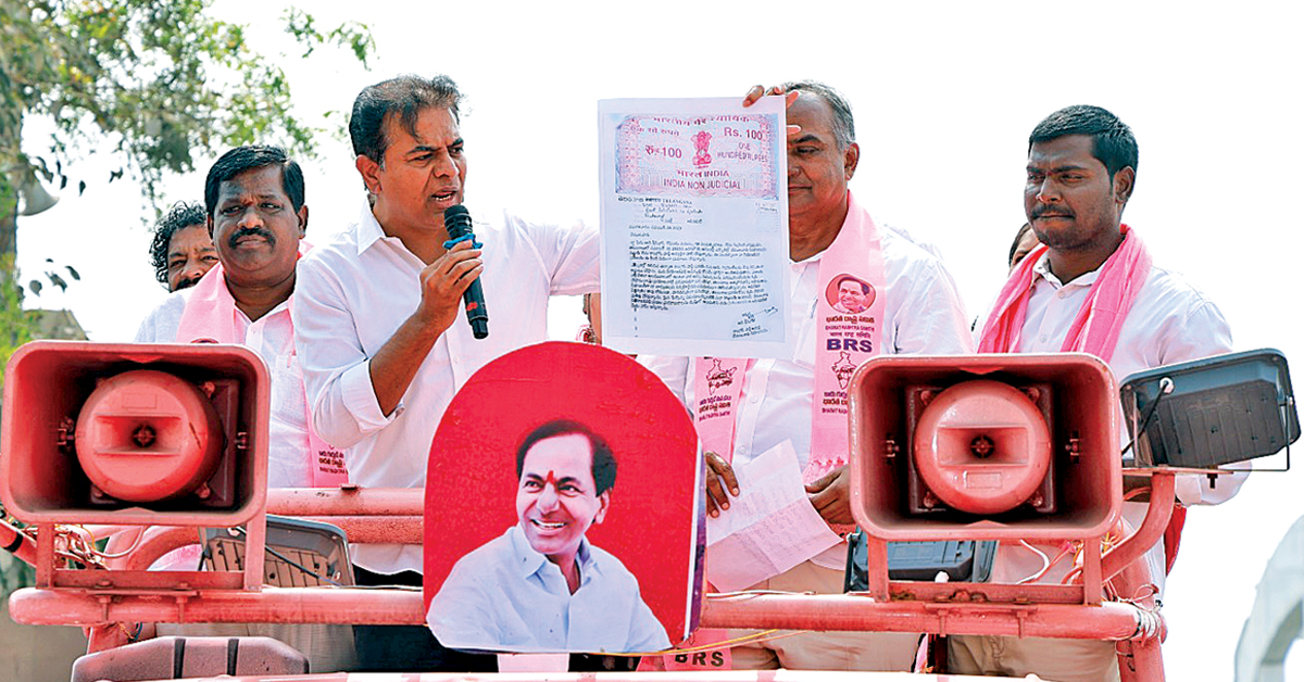 కులం, మతం పేరుతో ఓట్లు అడుగుతున్న బీజేపీ, హామీలను అమలు చేయకుండా మోసం చేసిన కాంగ్రెస్కు మున్సిపల్ ఎన్నికల్లో ప్రజలు బుద్ధి చెప్పాలని మాజీ మంత్రి, బీఆర్ఎస్ వర్కింగ్ ప్రెసిడెంట్ కేటీఆర్ అన్నారు. రాజన్న సిరిసిల్ల జిల్లా వేములవాడ పట్టణంలో శుక్రవారం మున్సిపల్ ఎన్నికల ప్రచార సభలో నియోజకవర్గ ఇన్చార్జి చల్మెడ లక్ష్మీనరసింహారావుతో కలిసి కేటీఆర్ పాల్గొని మాట్లాడారు. కాంగ్రెస్ పార్టీ దొంగ హామీలతో అధికారంలోకి వచ్చి ప్రజల్ని మోసం చేస్తోందని ఆరోపించారు. ఆరు గ్యారంటీల పేరుతో ప్రజలను మభ్యపెట్టి, అధికారంలోకి వచ్చిన తర్వాత ఒక్క హామీనీ సరిగా అమలు చేయలేదన్నారు. ఎన్నికల సమయంలో వేములవాడ ఎమ్మెల్యే ఆది శ్రీనివాస్ బాండ్ పేపర్పై రాసి ఆరు గ్యారంటీలను వంద రోజుల్లో అమలు చేస్తానన్న హామీని గుర్తు చేస్తూ.. ఆ బాండ్ పేపర్ను సభలో ప్రజల ముందు ప్రదర్శించారు. నాలుగు సార్లు ఓడిపోయానని, ఈసారి ఓటు వేయకపోతే చనిపోతానని సానుభూతి డైలాగులతో ప్రజలను మభ్యపెట్టిన ఆది శ్రీనివాస్.. ఆ తర్వాత అభివృద్ధి గురించి పట్టించుకోలేదని విమర్శించారు.