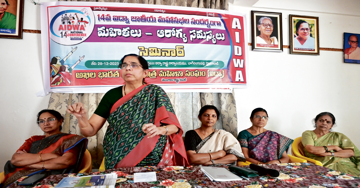 మహిళలకు పోషకాహారం తీసుకోకపోవడం వల్లనే ఆరోగ్య సమస్యలు వస్తాయని డాక్టర్ నళిని చెప్పారు. మహిళలు చిన్నతనం నుంచి వారిని పెంచే విషయంలో చూపించే అశ్రద్ధ నుండే, మహిళలకు ఆరోగ్య సమస్యలు మొదలవుతాయన్నారు. పోషకాహారం ఇవ్వడం, నచ్చిన పని చేసే విధంగా స్వేచ్ఛ ఇవ్వాలని సూచించారు. మహళలపై అధిక పని భారాన్ని తగ్గించాలని కోరారు. ఆదివారం హైదరాబాద్లో అఖిల భారత ప్రజాతంత్ర మహిళా సంఘం (ఐద్వా) 14వ జాతీయ మహాసభలను పురస్కరించుకుని ‘మహిళలు-ఆరోగ్య సమస్యలు’ అనే అంశంపై సదస్సు జరిగింది. ఈ సందర్భంగా నళిని మాట్లాడుతూ మహిళలు అధిక పని వల్ల సరైన ఆహారం తీసుకోకపోవడం వల్ల మహిళలకు యూరిన్ ఇన్ఫెక్షన్, గర్భసంచి సమస్యలు, క్యాన్సర్ వంటి సమస్యలతోపాటు, మానసిక సమస్యలకు గురవుతున్నారని తెలిపారు. వయస్సు పెరిగే క్రమంలో బాలికలు కౌమర యువతుల, శరీరంలో వచ్చే మార్పులపై అమ్మలు, టీచర్లు అవగాహన కల్పించాలని కోరారు. 40 ఏండ్లపై బడిన మహిళలు పీసీఓడీ సమస్యలు, క్యాల్సియం, థైరాయిడ్ వంటి సమస్యలకు గురవుతున్నారని తెలిపారు. మహిళలు ఆరోగ్యంగా ఉంటూ, కుటుంబాలను ఆరోగ్యంగా ఉండేలా చూసుకోవాలని సూచించారు. ఆరోగ్యంగా ఉండేందుకు తీసుకోవాల్సిన జాగ్రత్తలు తీసుకోవాలని తెలిపారు. సదస్సులో రాష్ట్ర అధ్యక్ష, ప్రధాన కార్యదర్శులు ఆర్. అరుణ్జ్యోతి, మల్లు లక్ష్మి, సహాయ కార్యదర్శులు కెఎన్ ఆశాలత, బుగ్గవీటి సరళ, ఉపాధ్యక్షురాలు టి. జ్యోతి, పి ప్రభావతి, రాష్ట్ర నాయకులు ఎమ్. వినోద, పి. శశికళ, ఎమ్డీ షబానా బేగం, బి.అనూరాధ, వై.వరలక్ష్మి, ఎ.శారద తదితరులు పాల్గొన్నారు.